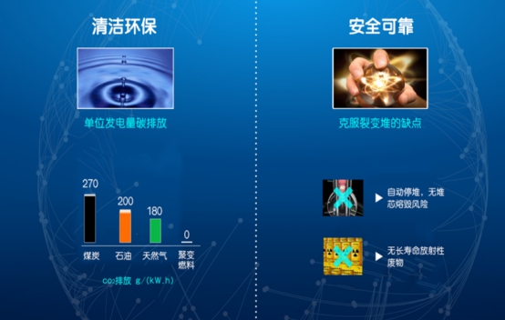 重zhong要yao的de是shi,這zhe種zhong新xin能neng源yuan產chan能neng效xiao率lv高gao。單dan位wei質zhi量liang氘dao氚chuan聚ju變bian燃ran料liao釋shi放fang能neng量liang比bi化hua石shi燃ran料liao高gao幾ji百bai萬wan倍bei,可ke為wei人ren類lei提ti供gong長chang時shi間jian能neng源yuan供gong應ying。並bing且qie反fan應ying過guo程cheng更geng清qing潔jie環huan保bao,不bu釋shi放fang造zao成cheng溫wen室shi效xiao應ying的de氣qi體ti,也ye不bu會hui產chan生sheng大da量liang高gao放fang射she性xing核he廢fei料liao。遇yu到dao自zi然ran災zai害hai、潛在危險、人為失誤時,可迅速停堆,避免嚴重事故發生。
